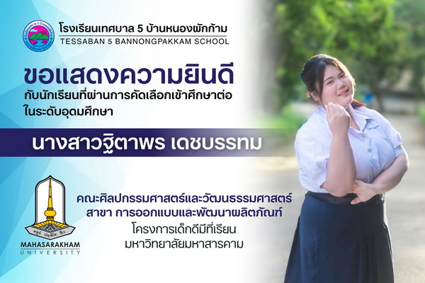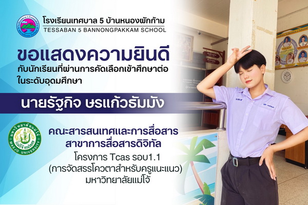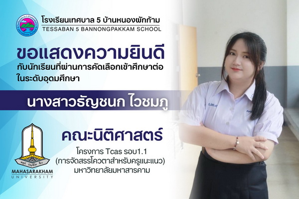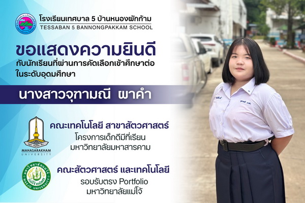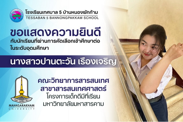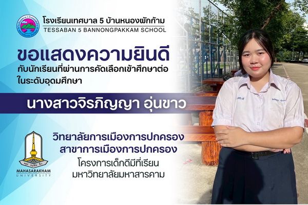 โรงเรียนเทศบาล ๕ บ้านหนองผักก้าม ขอชื่นชมและแสดงความยินกับนักเรียน ที่ได้รับการคัดเลือกเข้าศึกษาในระดับมหาวิทยาลัย เป็นความสำเร็จและความก้าวหน้าอีกระดับหนึ่งของนักเรียน